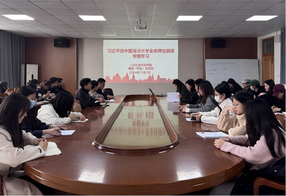 11月1日,人文社会科学学院第四(学生)党支部开展集体学习,学习习近平给中国海洋大学全体师生的回信。会议由支部书记曹斯亢主持,第四(学生)党支部全体党员参加。
