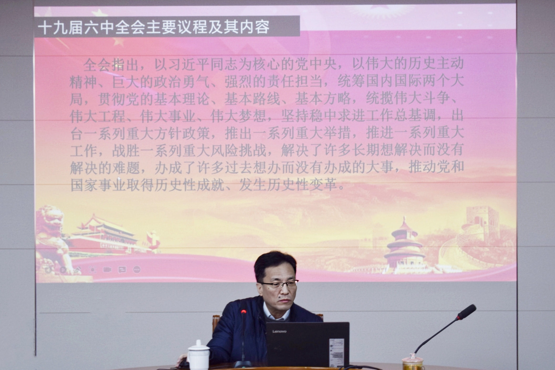 12月2日,党总支书记祝茂凯先后面向党总支理论中心组成员及全体教职工作党的十九届六中全会精神专题宣讲,学校党委第一巡察组组长肖传强、副组长白连万、联络员王政军出席指导。祝茂凯分六个方面对全会精神进行了深入系统地阐释:一是深刻认识总结党的百年奋斗重大成就和历史经验的重大意义,二是深刻认识党的百年奋斗的初心使命和重大成就,三是深刻认识中国特色社会主义新时代的历史性成就和历史性变革,四是深刻认识党的百年奋斗的历史意义和历史经验,五是深刻认识以史为鉴、开创未来的重要要求,六是从党的百年奋斗历程中汲取智慧和力量。