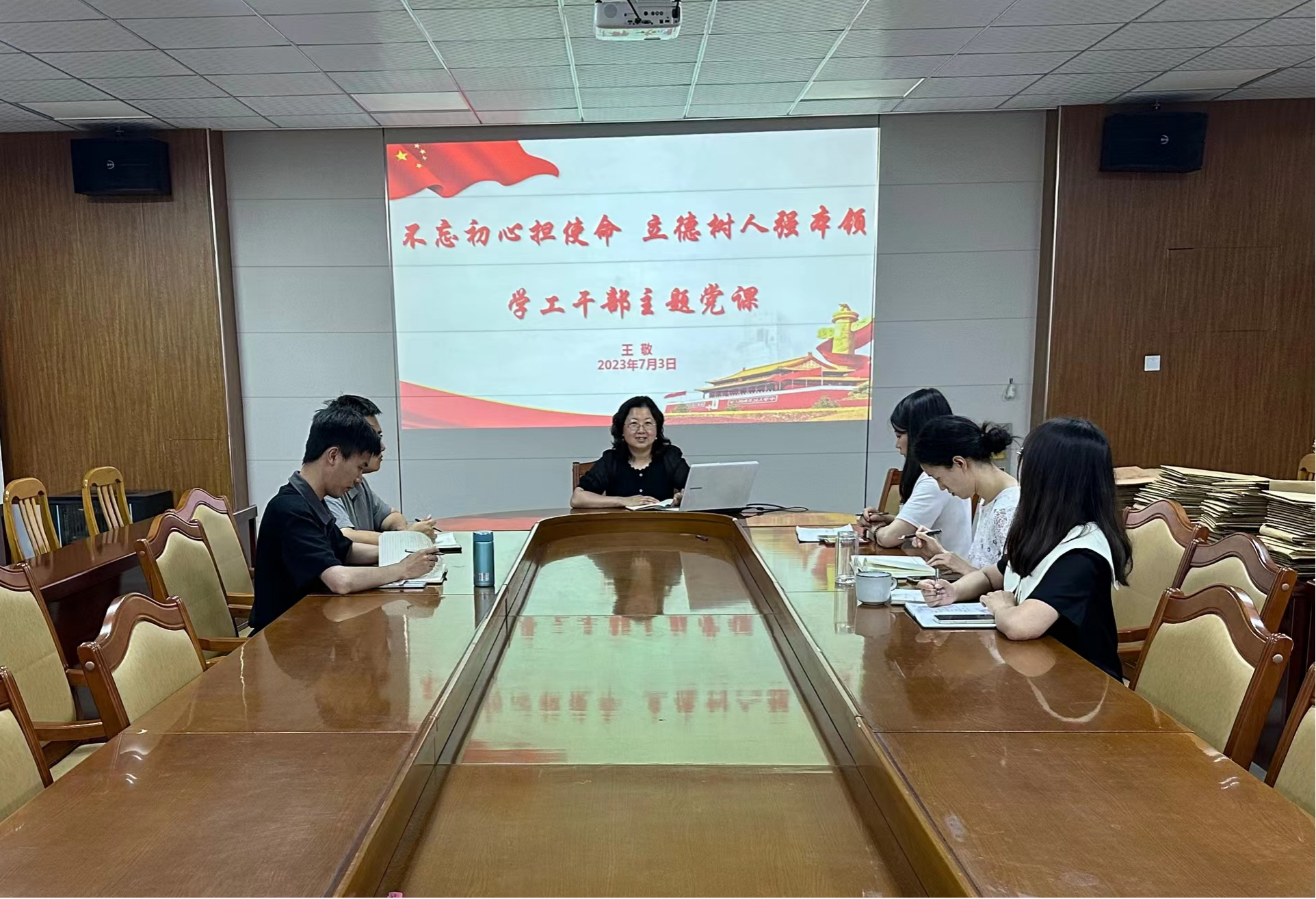 王敬指出,在全面贯彻党的二十大精神的开局之年,我们迎来中国共产党成立102周年。作为学工干部,工作在立德树人一线,应自觉以习近平新时代中国特色社会主义思想为指导,武装头脑,指导实践。她围绕学生工作实际强调,一要树立规矩意识,严格遵守学校规章制度、组织纪律,杜绝得过且过、不讲原则的工作态度,帮助学生养成良好的品行。二要注重因材施教,针对不同学生的特点,在坚持原则的基础上,灵活处理具体事务,切实践行高校思想政治工作的“三因三遵循”原则。三要加强思想引领,牢牢把握大学生成长的关键节点,提升思想政治教育工作针对性,鼓励、指导和帮助学生参与各式各样的活动,不断提高思政工作能力和育人水平。