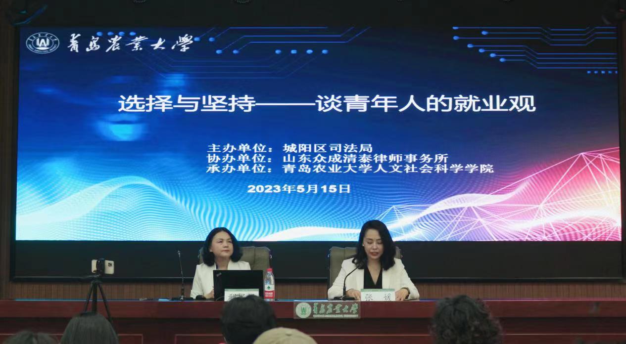 为深入开展调查研究,扎实推动主题教育走深走实,5月15日,人文社会科学学院联合城阳区司法局共同举办“选择与坚持——谈青年人的就业观”主题讲座活动,邀请山东众成清泰律师事务所高级合伙人邢妮妮律师以“选择与坚持——做最好的自己”为题与学生分享经验,共助学生成长成才,夯实立德树人根本任务。