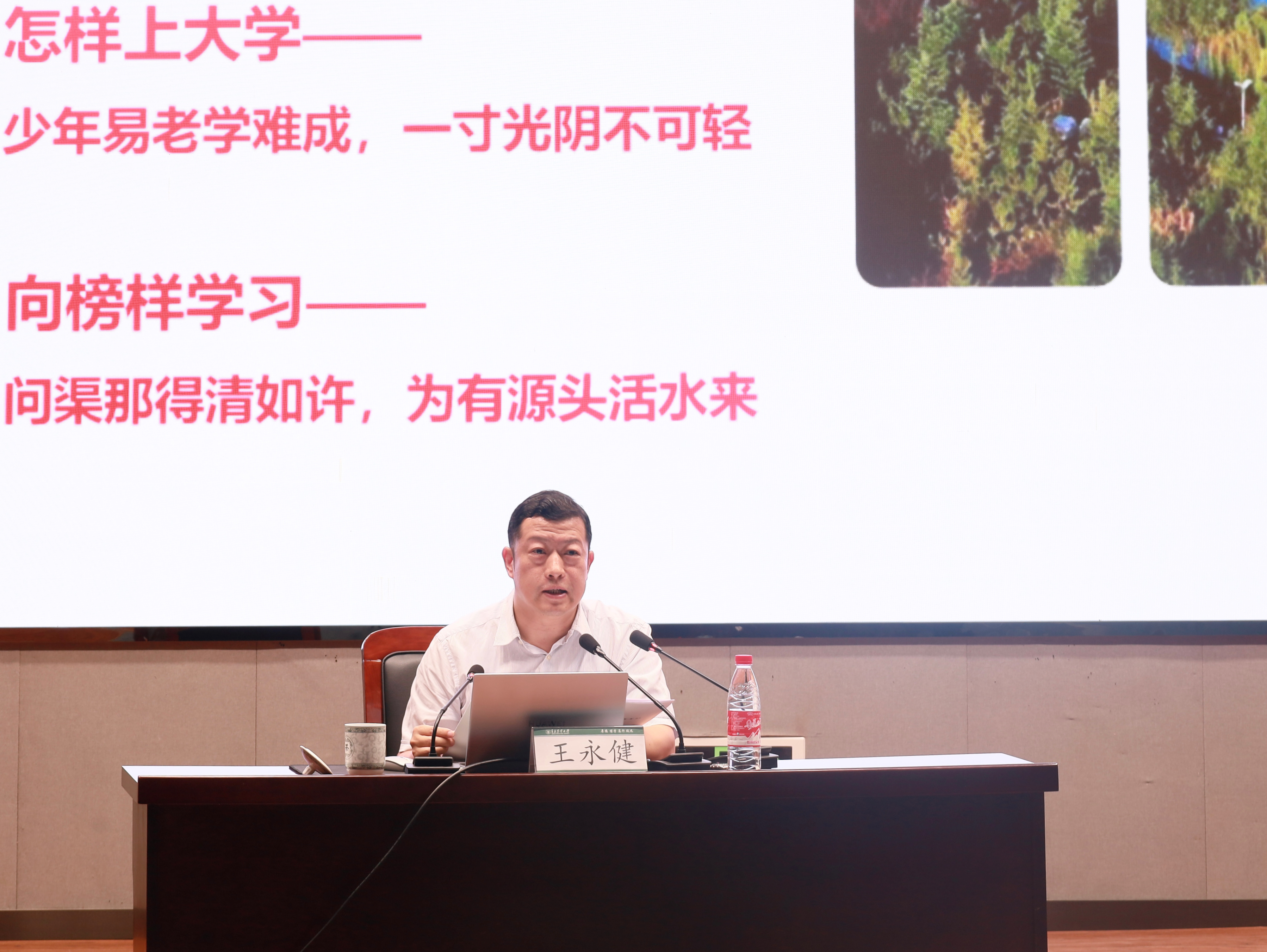 王永健以“不负青春韶华,勇担时代重任”为题,向新生介绍了学校72年的历史沿革、取得的重大发展成就、重要历史贡献和宝贵的办学经验。他以学校基本情况介绍为切入点,引出问题,启发思考,增进了同学们对学校的了解和归属感;通过古今中外大师名家对大学的认识,解读了大学的本质和基本职能,加深了同学们对大学的理解和认识;从习近平总书记对青年一代的殷殷嘱托,青年大学生对时代发展的使命担当,为同学们分析了为什么要上大学;着眼大学生活的基本规律、时代和社会发展的需要,解答了大学学什么、怎样上大学,帮助同学们明确了上大学的目标和任务;通过介绍学校众多优秀校友的典型事迹,为同学们树立了标杆和榜样,找到了奋发前进的动力和方向。