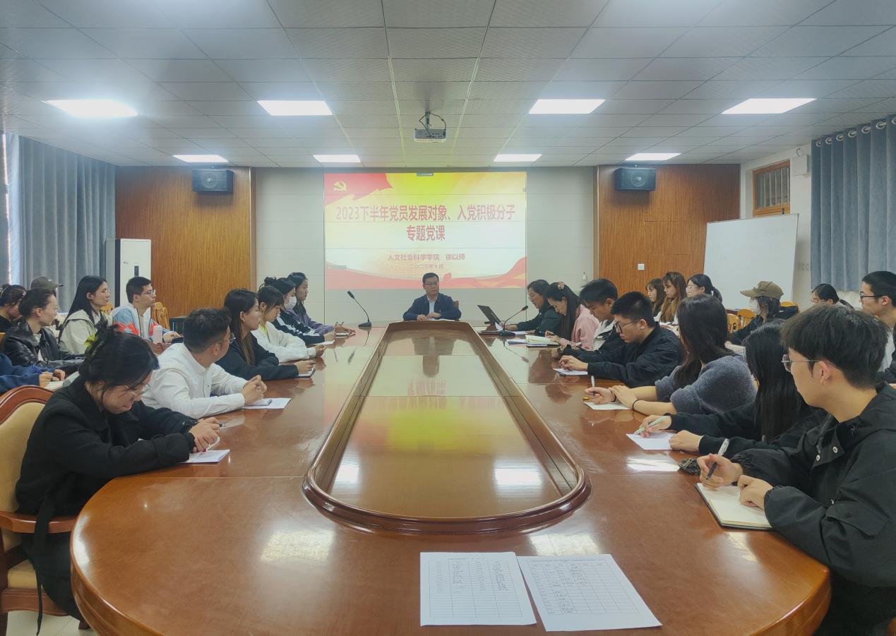 10月27日,人文社会科学学院于文经楼C515举行2023年下半年入党积极分子和发展对象培训班开班仪式,党委书记徐以师出席会议并为全体学员上党课。党委副书记、副院长王敬主持会议,全体辅导员老师及本期入党积极分子和党员发展对象参加会议。