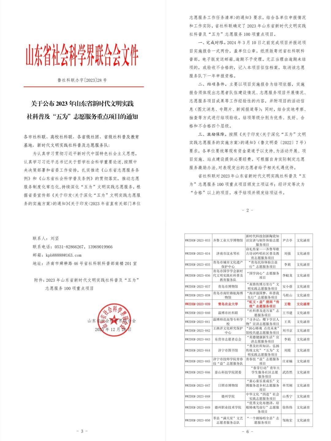 12月26日,山东省社会科学界联合会下发了《关于公布2023年山东省新时代文明实践社科普及“五为”志愿服务重点项目的通知》,人文社会科学学院申报的“‘虹文·益’浸润‘传统’志愿服务项目”获评重点项目。