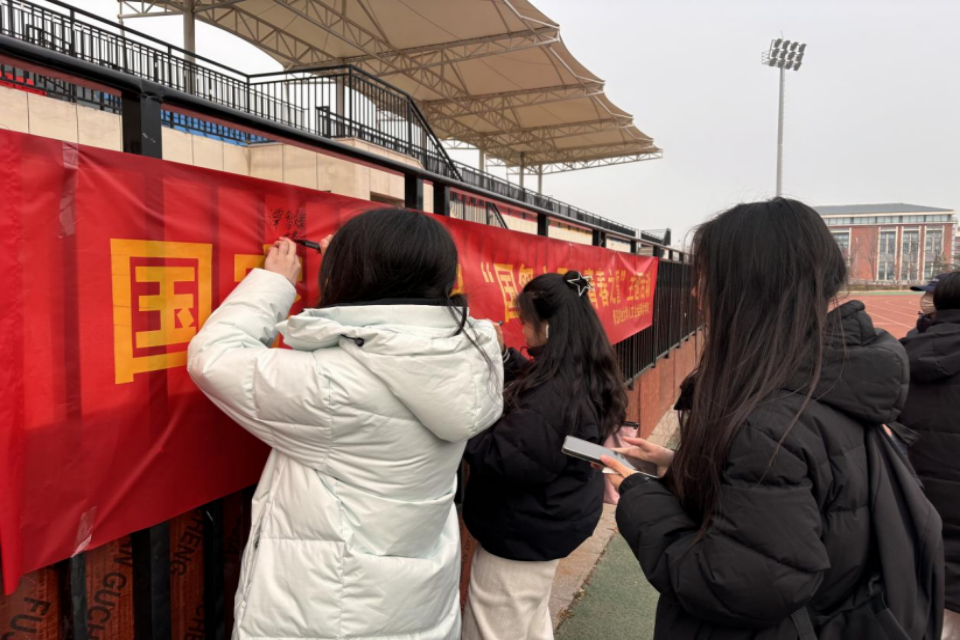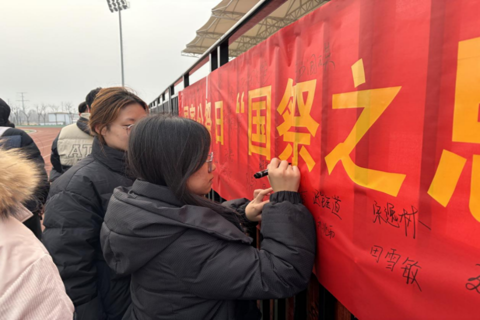 全体师生有序地来到横幅前,低头拿起笔,郑重地签下自己的名字。每一个签名都承载着一份铭记历史的决心、对遇难同胞的深切哀思以及强国复兴的青春誓言。
