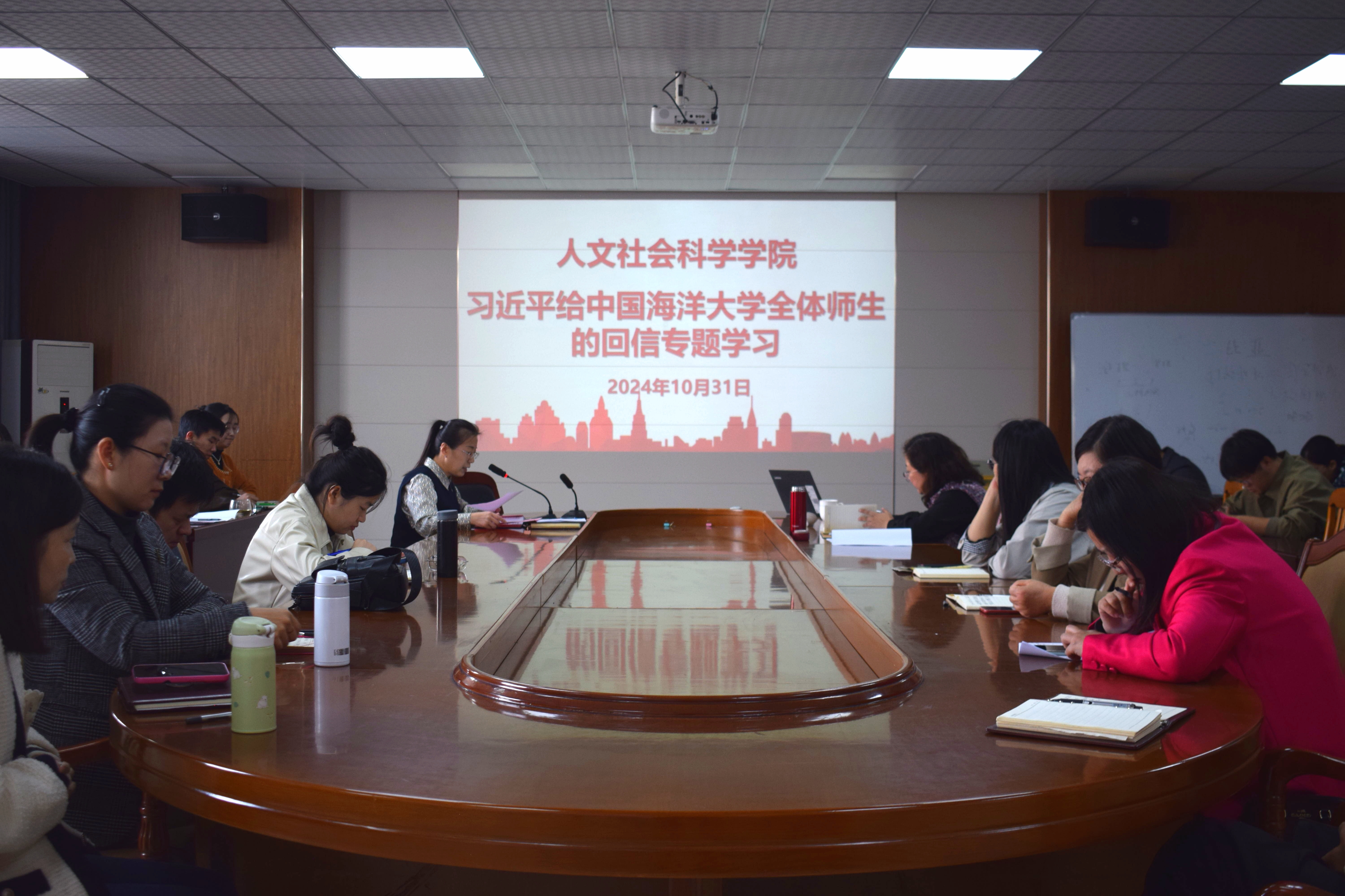 10月31日,欧洲杯买球官方官网召开教职工政治理论学习暨工作例会,专题学习习近平给中国海洋大学全体师生的回信。会议由学院党委副书记、副院长王敬主持,全体教职工参加。