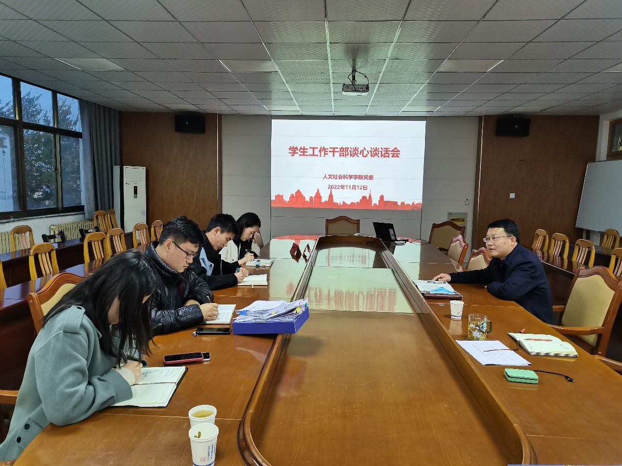 为进一步提高学院学工干部的履职能力,2022年11月12日,人文社会科学学院在文经楼C515会议室召开学生工作干部谈心谈话会,学院党委书记徐以师出席会议并与学工干部开展谈心谈话。会议由院党委副书记、副院长王敬主持,全体学工干部参加会议。